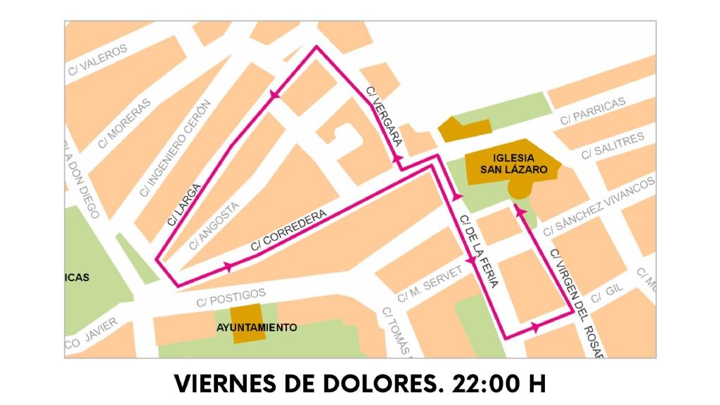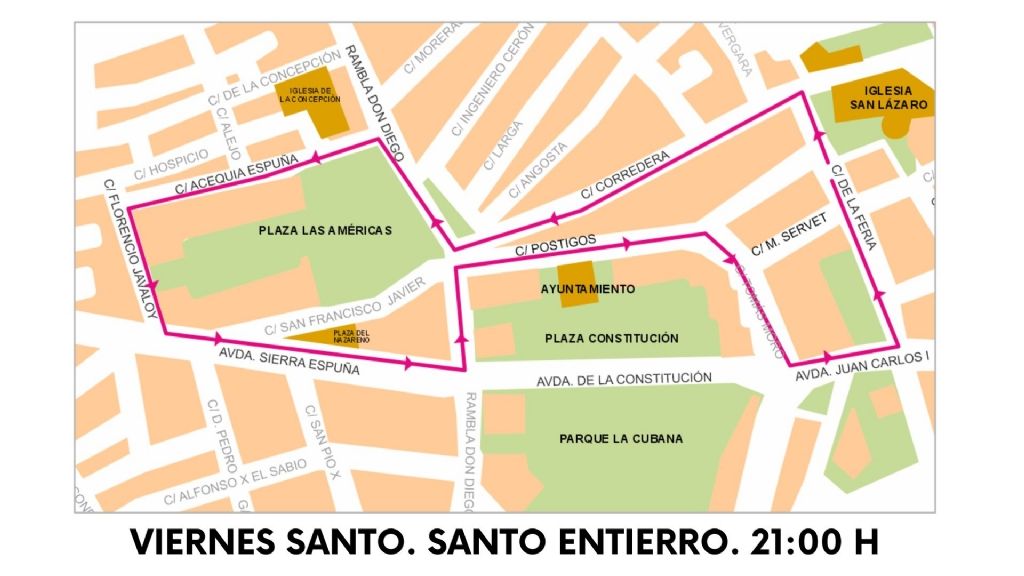 Feria, Corredera, Rambla Don Diego, Acequia Espuña, Florencio Javaloy, Avda. Constantino López, Rambla Don Diego, Postigos, Tomás Moro, Avda. Juan Carlos I, Feria, Parroquia de San Lázaro Obispo