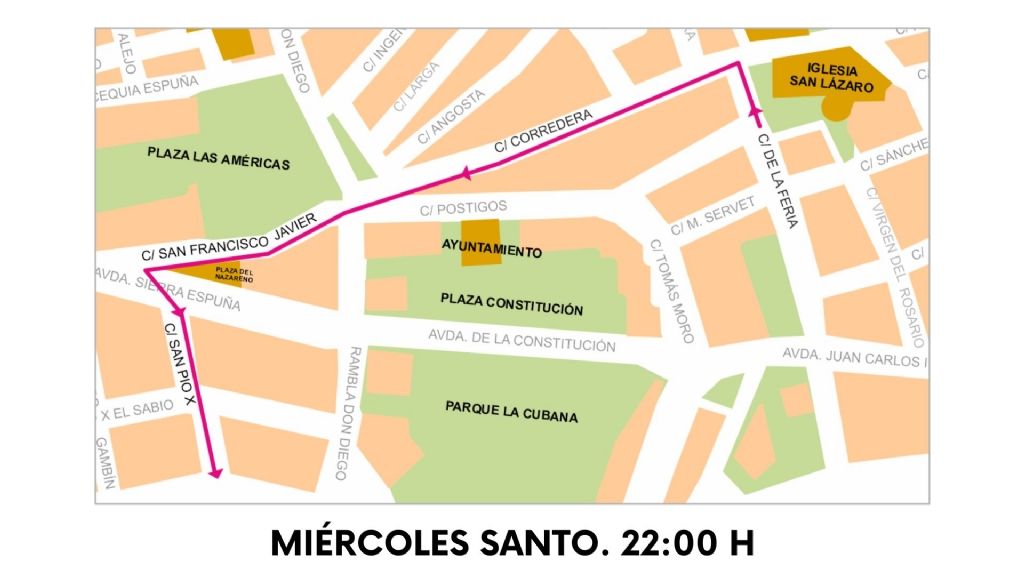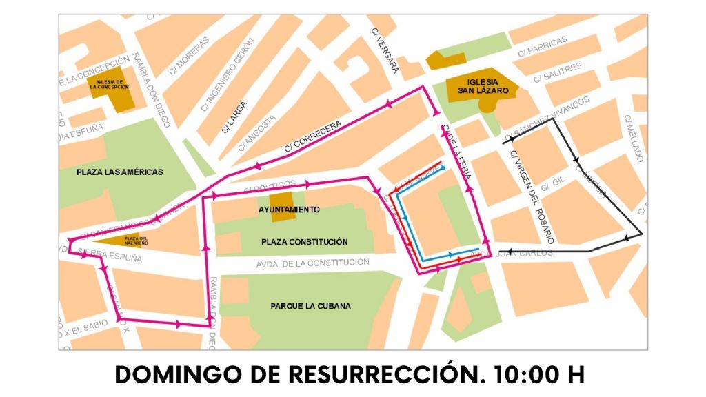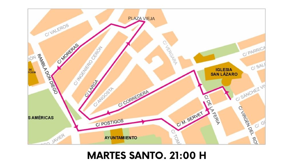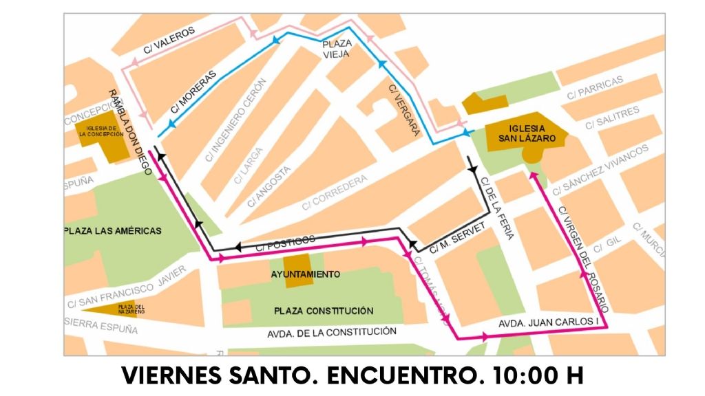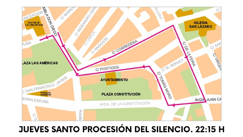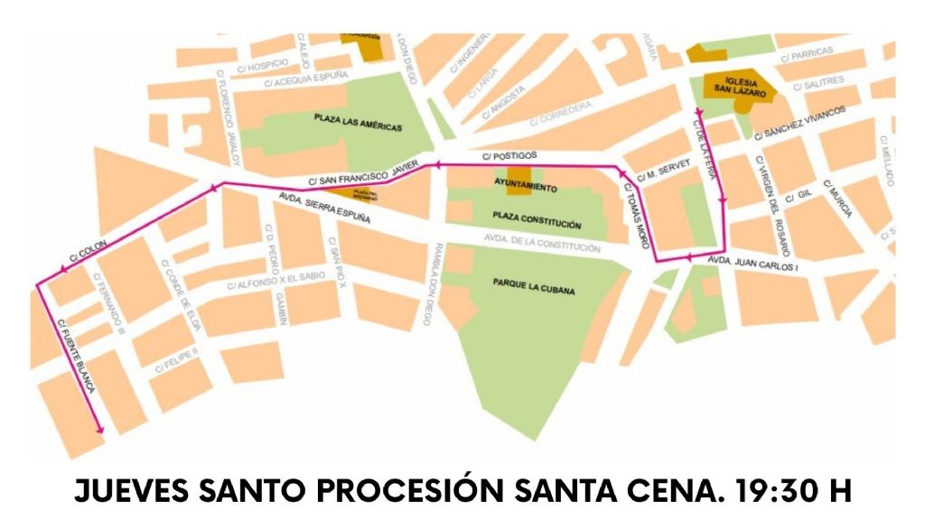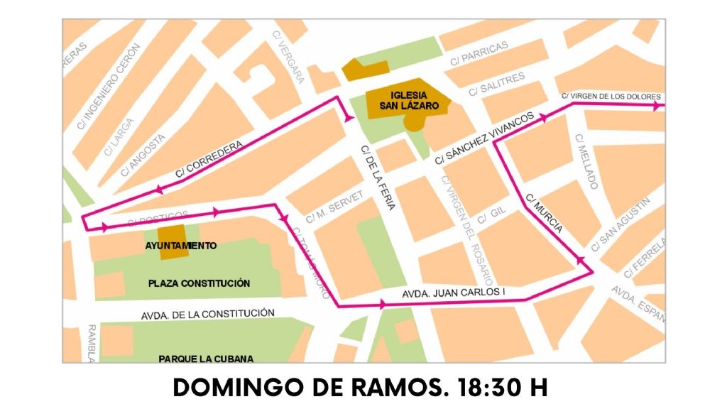 La Feria, Corredera, San Francisco Javier, Plaza del Nazareno, Avda. Sierra Espuña, San Pío X, Alfonso X El Sabio, Rambla Don Diego, Postigos, Tomás Moro, Avda. Juan Carlos I, La Feria, Parroquia de San Lázaro Obispo